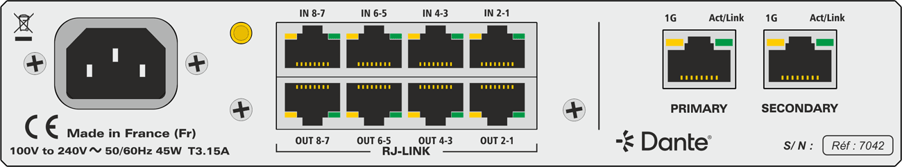 The PCS410 is a 2-in-1 device, designed specifically for our RJLink range of equipment. It allows our RJLink interconnect system to interface with a DANTE or AES67 IP audio network. It incorporates both an 8-in/8-out DANTE/AES67 audio converter and a 24V/1.5A power supply with overload protection.