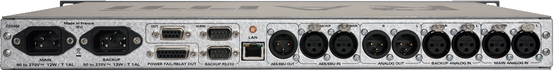 Le CSS404 est un équipement destiné à surveiller en permanence une source audio stéréo numérique ou analogique. Câblé en insertion dans une chaîne de diffusion Broadcast, il permet en cas de problème de basculer automatiquement sur une source de secours numérique ou analogique et de revenir automatiquement, suivant les paramètres programmés, sur la source principale une fois les problèmes résolus.