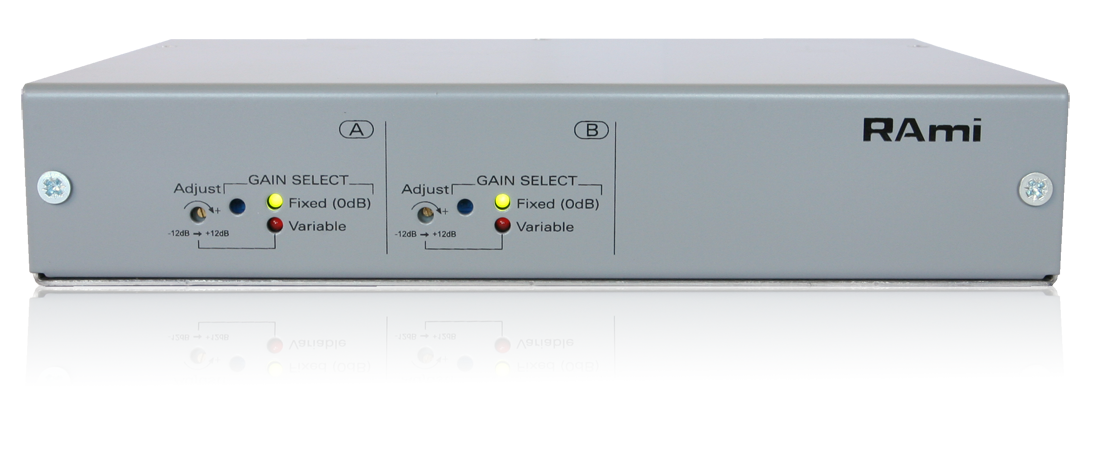 - Le gain d’entrée/sortie peut être soit fixe, soit ajustable en face avant de +/- 12 dB, et ceci indépendamment sur chaque canal.