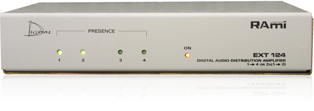 L'EXT124 est un amplificateur de distribution permettant la transmission d'un signal audio numérique vers 4 départs de même type ou de deux signaux numériques vers deux départs.